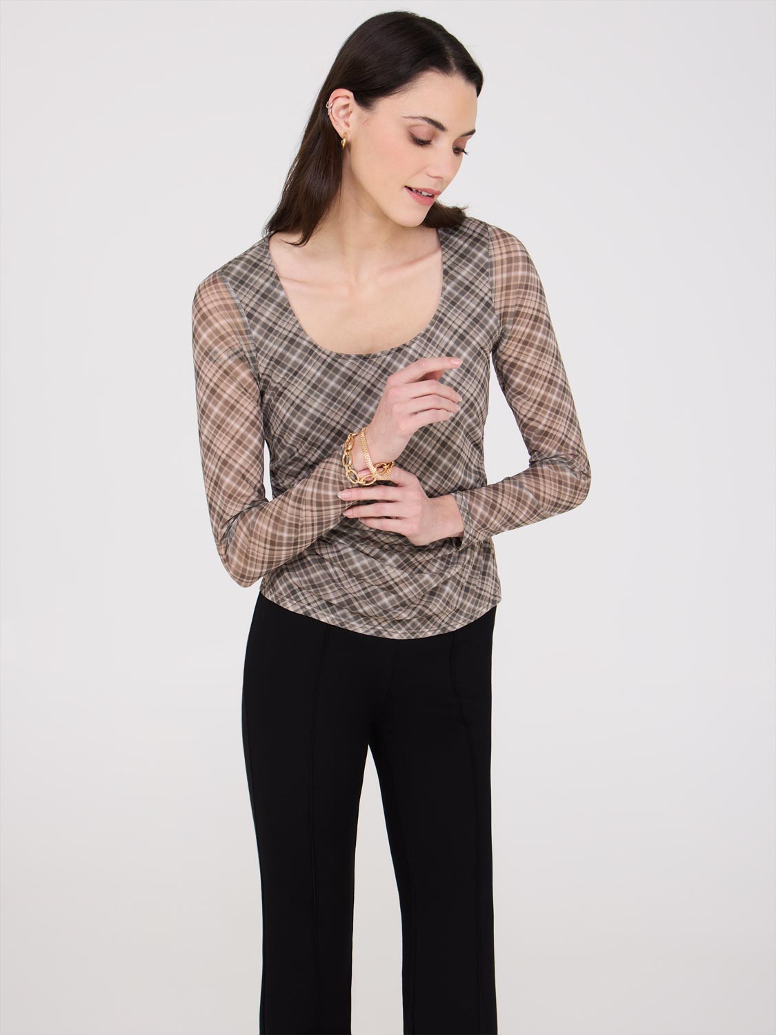 A trendy take on a classic scoop neck. this plaid mesh top is a statement piece that looks stylish with high-waisted jeans or sleek faux leather pants.Knit top Long sleeves Bias plaid printed mesh Scoop neck Side ruching Fully lined Model is wearing size XS Fabric: 96% polyester. 4% spandex Lining: 100% polyester Machine wash in cold water Hang to dry