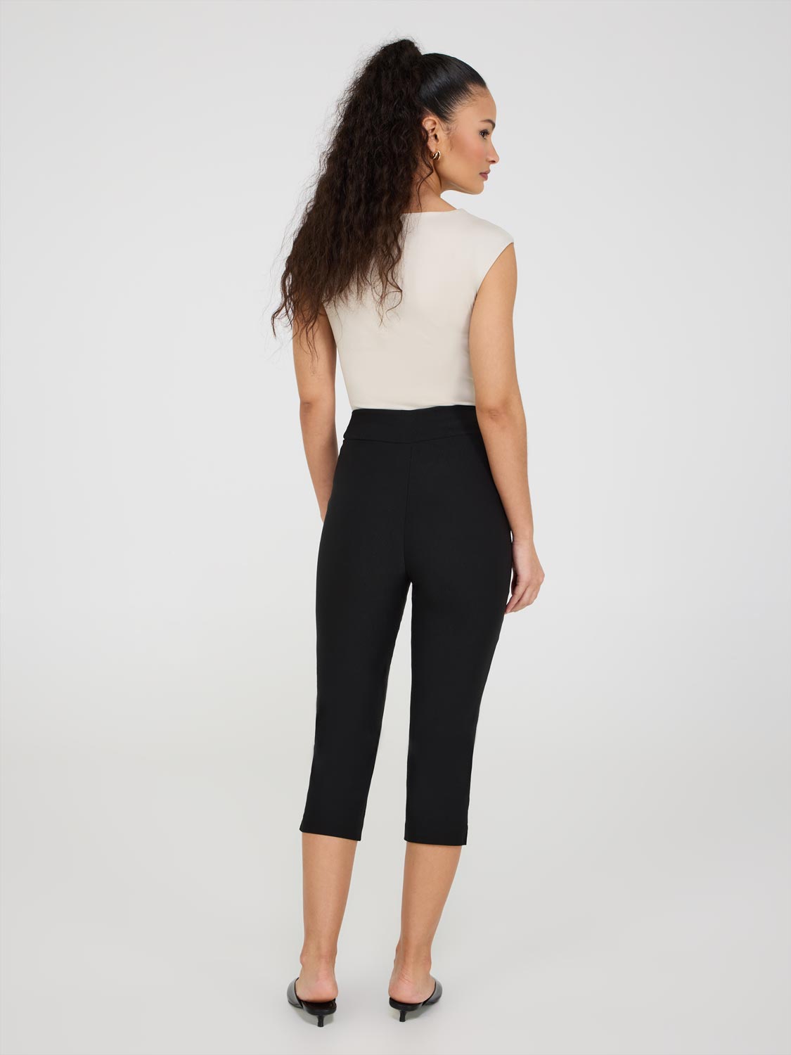Our capri pants with slit hem offer a modern twist on classic warm-weather bottoms. perfect for day to night transitions.Woven capris Pull-on High-rise Side slit at hem Fake fly 19 1/2" inseam Model is wearing size XS Fabric: 76% rayon. 21% nylon. 3% spandex Machine wash in cold water Hang to dry
