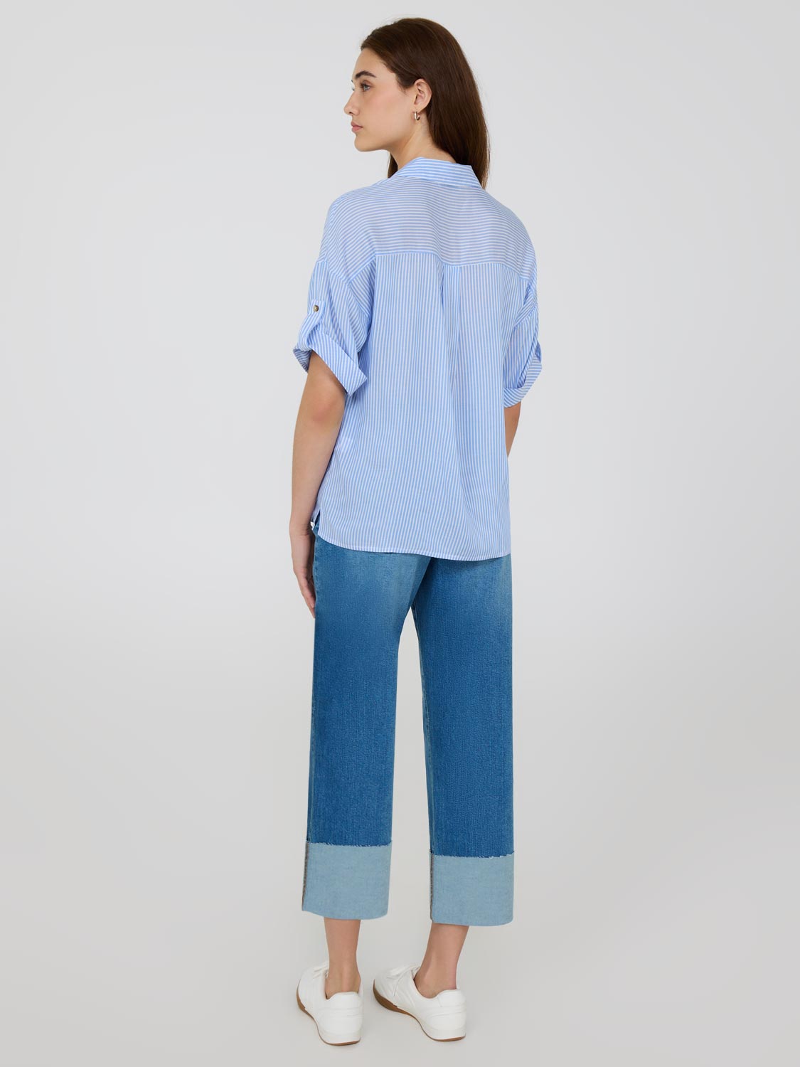 Bring effortless style to all your sun-soaked summer plans with our breezy striped short sleeve blouse.Woven shirt Striped Short sleeve Casual Functional sleeve tab Drop shoulder Side slits Shirt collar Exposed placket Button-front Loose fit Model is wearing size XS Fabric: 100% viscose Machine wash inside out in cold water Hang to dry