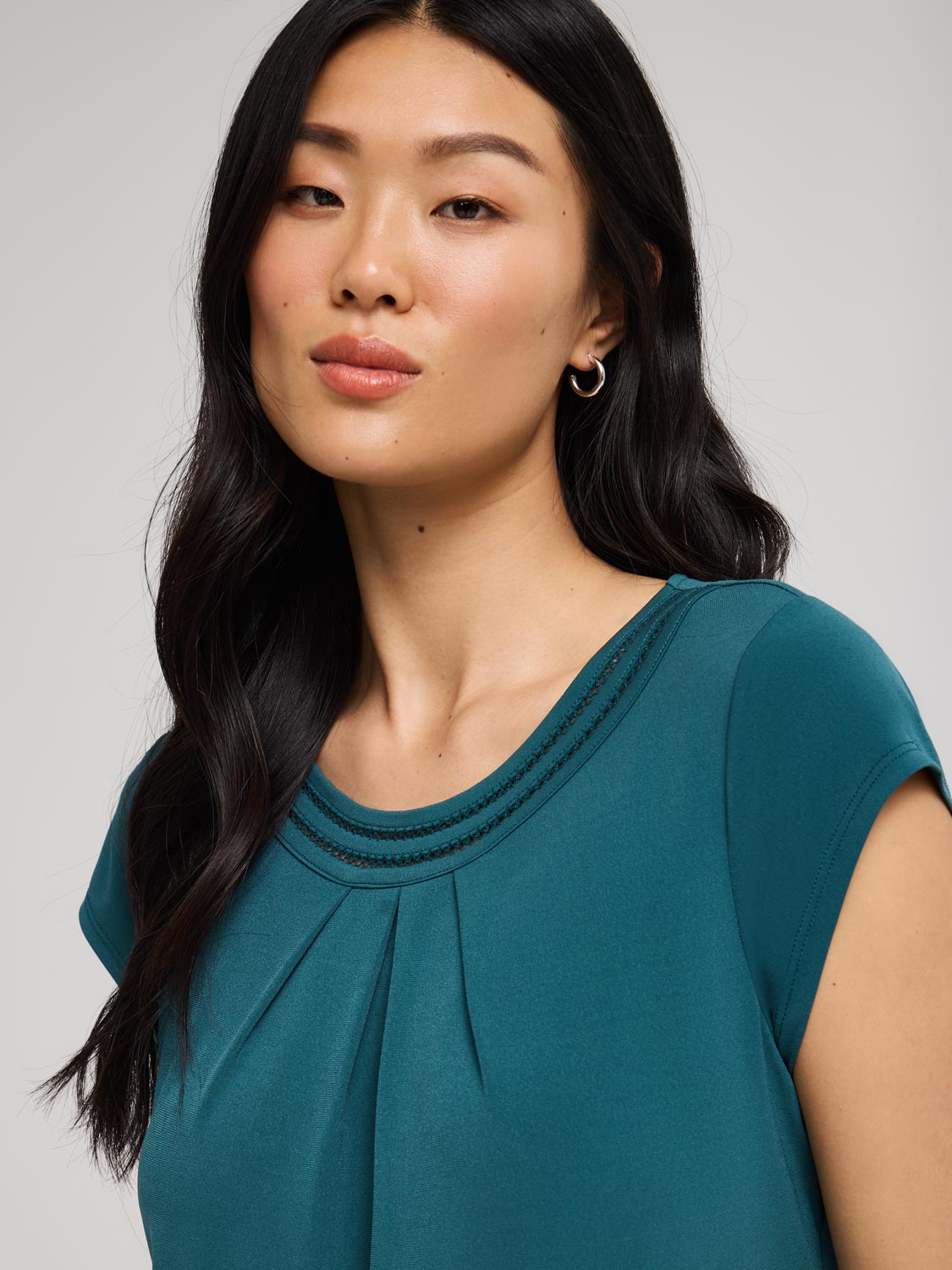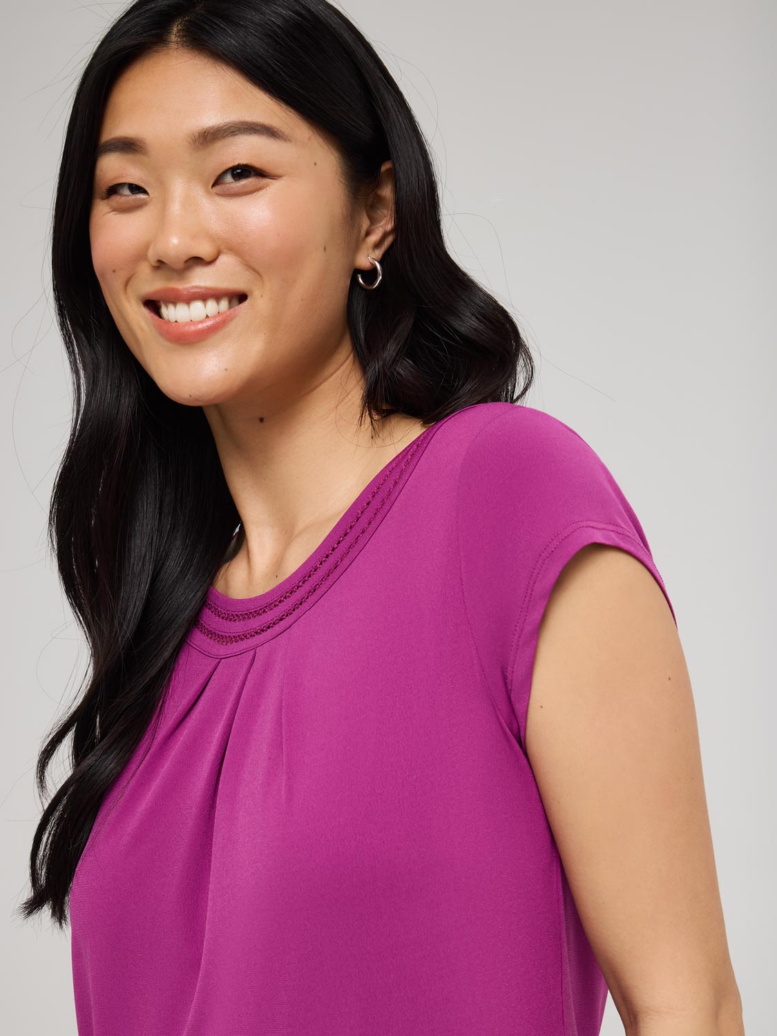 This classic top brings a subtle. feminine twist with delicate crochet detailing around the neckline. adding charm to simple. everyday looks.Knit top Cap sleeves Solid stretch Jersey Round neck top with crochet insert at neckline Pleat details Back keyhole with button Model is wearing size XS Fabric: 95% polyester. 5% spandex Machine wash in cold water Hang to dry