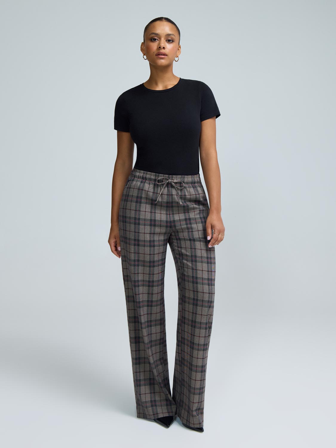 Designed to take you through fall stylishly. these wide-leg pants feature a plaid print that's a favourite for work-to-weekend dressing.Woven pants Yarn dye plaid Wide-leg Elastic waistband with drawstring at waist Trouser pockets Model is wearing size XS Fabric: 65% polyester. 33% rayon. 2% spandex Machine wash in cold water Hang to dry