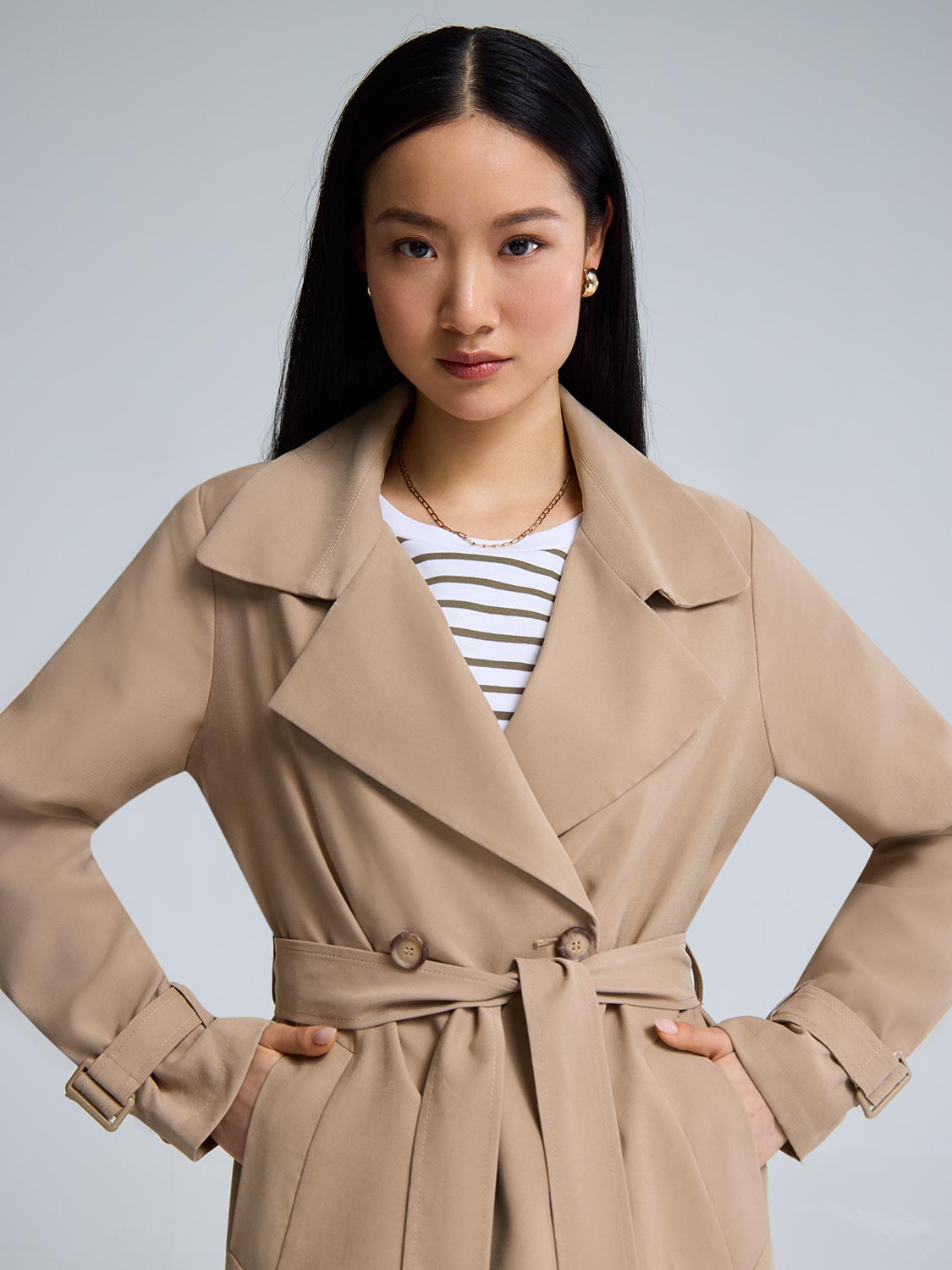 Made for days with unpredictable weather. this belted mid-length trench coat is a familiar classic that combines timeless style with functionality.Woven trench coat Belted Mid-length Lined Model is wearing size XS Fabric: 92% viscose. 8% polyester Lining: 100% polyester Dry clean